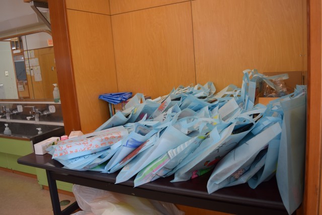 実際に、海外の方、県外の方がたくさんいたので、3人一組でどんどん配りに行きました。ただ渡すだけでなく、「少し,お時間よろしいですか」とインタビューも行いました。110袋ほど配り、インタビューにも答えていただきました。