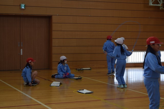 2年生は、学年体育です。なわとびカードにある跳ぶ技の種類や数に挑戦していました。すいぶんじょうずになって自信をもって跳んでいました。