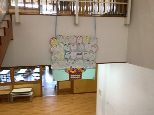 1年生は、生活科で水栽培をしてきたヒヤシンスの花が見守る中、作品の持ち帰りの準備が整いました。教室には、お手製のスイミーの仲間が、みんなと過ごしています。「校長先生!スイミーだよ。マグロもいるんだよ」と教えてくれました。