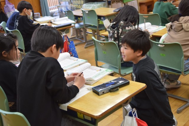 6年生は、課題に対して教え合ったり質問したりする場面でした。6年間の指導内容を終え、中学校数学の入り口にあたる学習をしています。分からないところを質問できることは大切な力です。