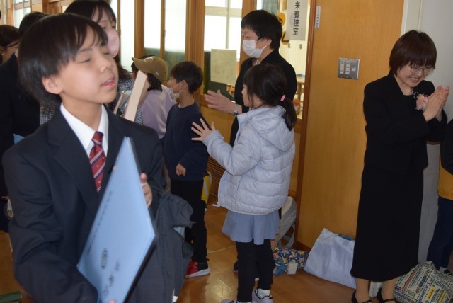 子どもたちも、神妙な顔で一人一人のお別れの言葉を聞き、心を込めて校歌を歌いました。泣き出す子どもたちも、校歌がプレゼントになると、精一杯歌う姿に、胸をうたれました。花道をつくり一人一人お別れをする時間は、温かな空気に包まれました。