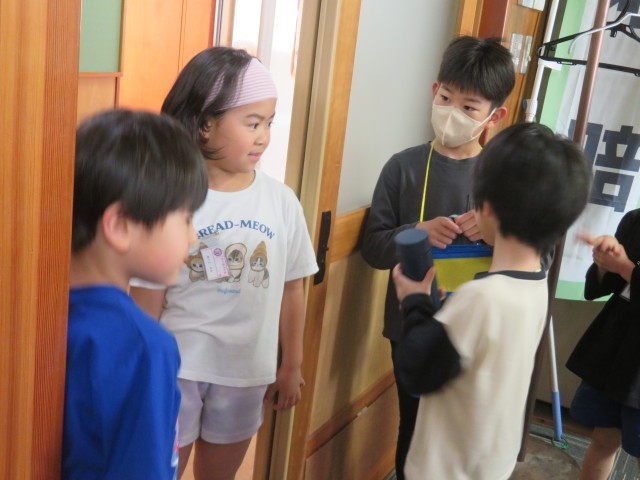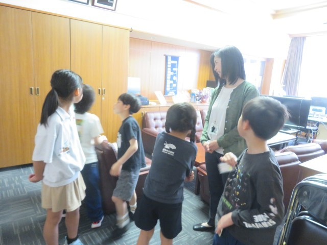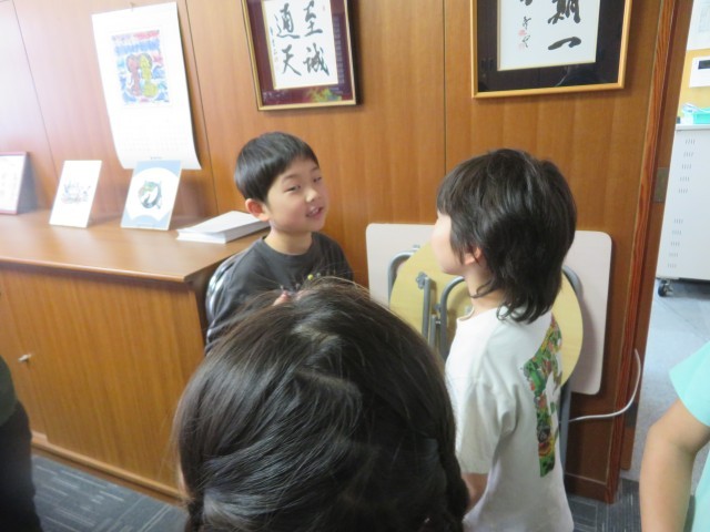 校長室を案内しに来た2年生が、校長室に入るときの話し方や遊ぶことができると伝えます。2年生がとても頼もしく感じられます。1年生は、教えてくれる2年生が次々話しかけるので、忙しそうでした。