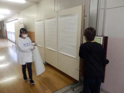 6年生の準備の続きです。「がんばりボード」を設置してくれたり、いろいろな表示を貼ってくれています。みんなが声を掛け合い、笑顔で協力しながら準備してくれたおかげで短時間で完了しました。さすが、最高学年!