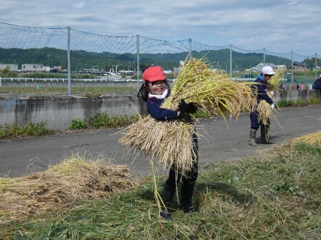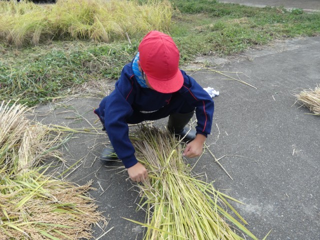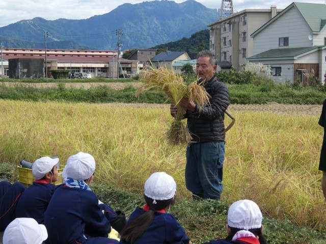 実りの秋!5年生が稲刈り体験をしてきました。始めは難しそうな手つきでしたが、慣れてくると抱きかかえるほどに黄金色に実った稲を刈っていました。ただ、刈った稲を結ぶ作業がまた難しく、苦労していました。子どもたちも、「南魚沼産のお米が日本一だ」というプライドをもっています。稲刈りの作業を通して、さらに実感できたようです。