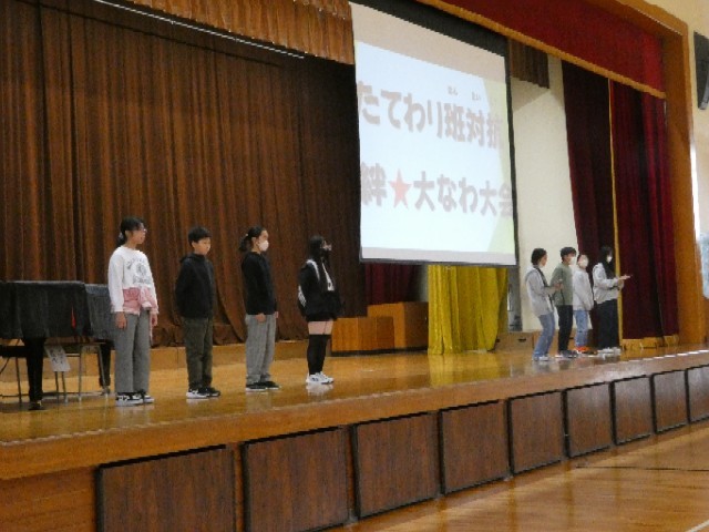 本日、いじめ見逃しゼロスクール集会を行いました。みんなが仲良く協力して生活していくために、辰の子委員会が、「絆大縄チャレンジ」の取組を紹介しました。また、「いじめ見逃しゼロ宣言」を各学級で話し合い、全校に紹介し実践していきます。その他にも、生活目標「みんなできずなを深めよう」に向けて、「いいことメッセージ」を書き、自己有用感を高めています。気温は下がり寒くなってきましたが、北辰小学校が温かい雰囲気に包まれていきたいと思います。