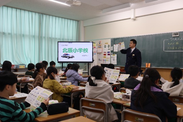 3年生は、社会科の学習で地域のことについて学習しています。今回は、南警察署の「おまわりさん」を教室にお招きし、警察について学習しました。警察官の仕事についてまとめた動画を見せていただいたり、用意していただいた資料で、装備品や専門部署について教えていただいたりしました。警察官は、「市民の安全と安心を守ることがやりがいです」という言葉が、子どもたちの心に残ったようです。