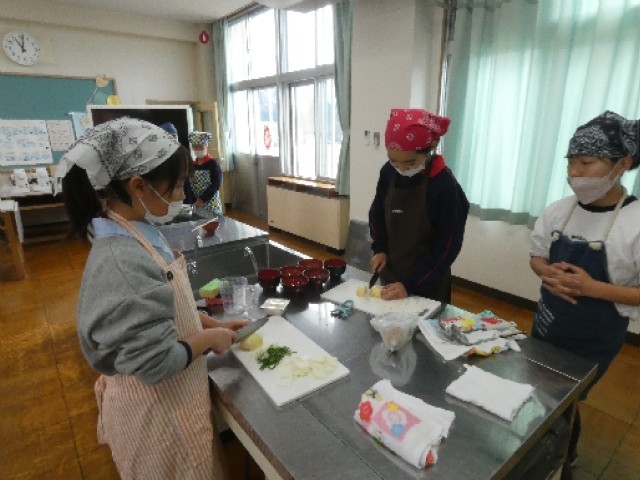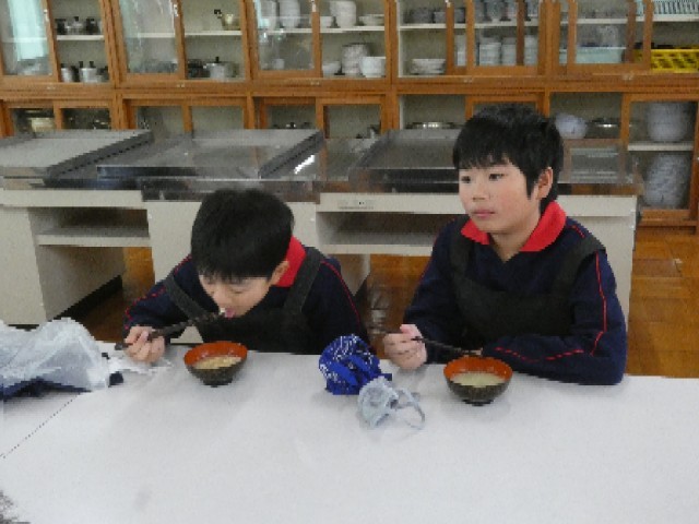 5年生が家庭科の授業で、味噌汁作りに挑戦しました。野菜の分量や切り方、具材を入れるタイミング、火加減など、学習をしてからの調理実習でした。味噌汁作りは初めての子も多かったですが、グループで協力して作業を進めてできあがりました。いつも慣れている家庭での味とは違いましたが、おいしくいただいていました。