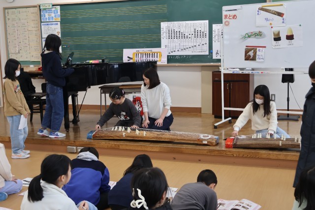 4年生が、音楽の授業「日本の音楽でながろう」で、琴の演奏に挑戦しました。子どもたちに聞いてみると、はじめて琴に触る子がほとんどでした。八海中学校からお借りした琴を一人一人が緊張しながら、楽譜を見て『さくら』を弾いていました。