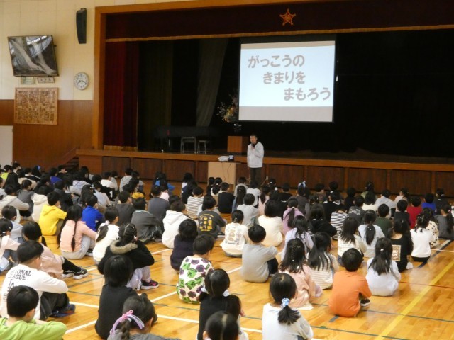 北辰小学校には、子どもたちが学校生活を気持ちよく過ごすために、「辰の子10のやくそく」があります。生活朝会で、4月はまず、4つのことを重点に、やくそくを守っていくことを確認しました。
