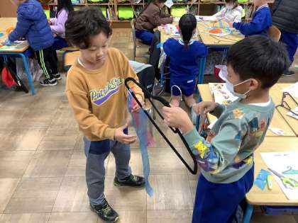 折り紙やビニールテープ、習字紙などいろいろな材料をハンガーに付けて飾りを作ります。飾りの長さや材料を変えると揺れ方も変わることに気付き、自分で揺らしながらイメージしたものを作っています。どの子もその子なりの思いを持ち、工作を楽しんでいます。