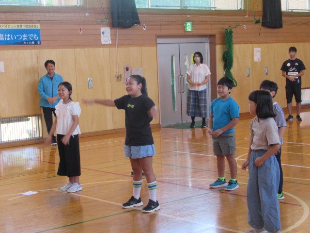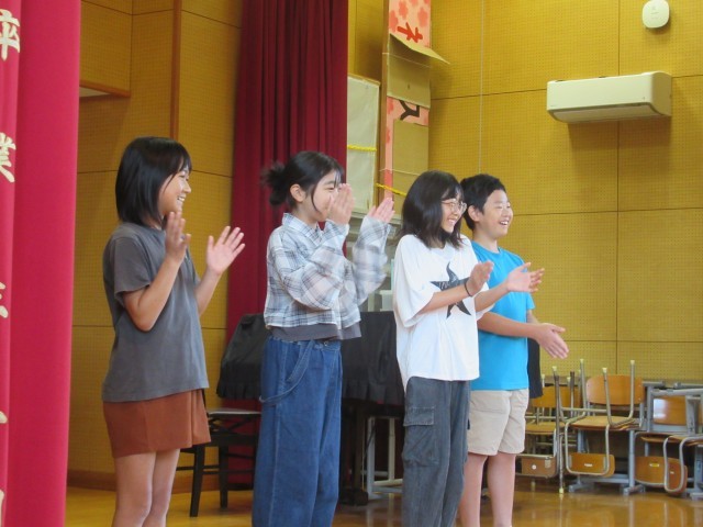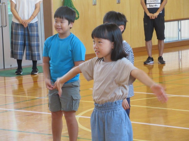 元気いっぱいエールを送る1~4年生、少し恥ずかしそうに照れながらもうれしそうな5・6年生。