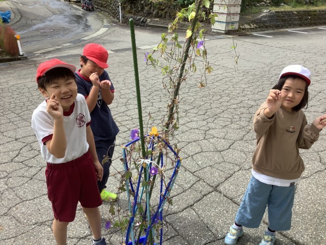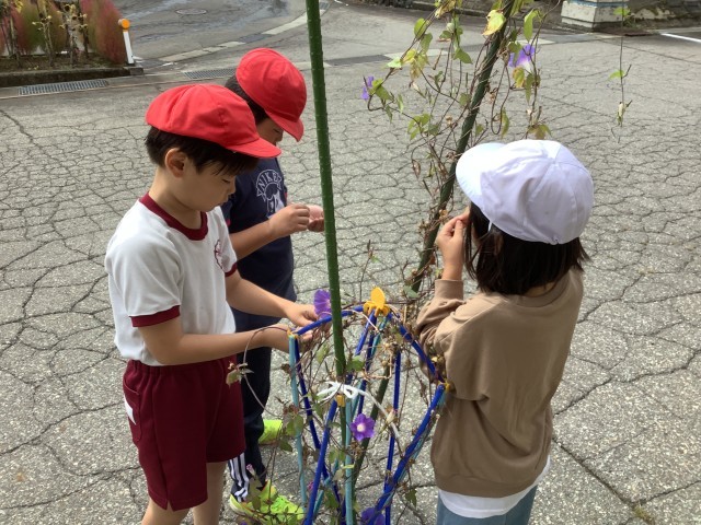 春にまいたアサガオの種から、夏には青や紫の花がたくさん咲きました。