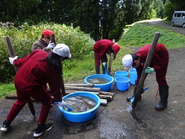 一本一本の柱の棒を磨いたり、ネットを片付けたり、自然と生まれる役割、みんなで力を合わせて作業を進めました。