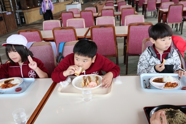 今回の遠足の昼食は、先日の軽トラ市での栃っ子米の売り上げの一部を使い、子どもたちが好きな物を注文して食べました。