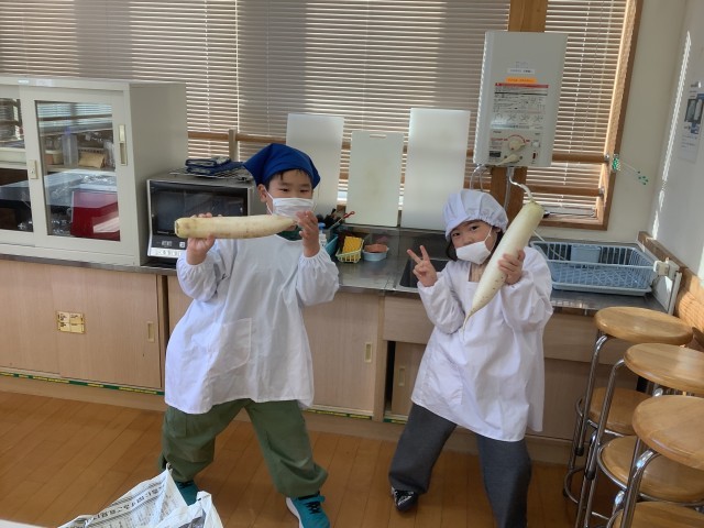 先日、子どもたちが育てて収穫した大根を使って、「大根もち作り」を行いました。