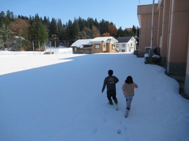 休み時間、職員室に低学年の子どもたちがやってきて「先生、一緒にグラウンドに行こう!・・・じゃなかった、行けませんか?」と声を掛けてくれました。一昨日の朝から昨日まで続いた降雪、栃窪小のグラウンドは白く輝いています。