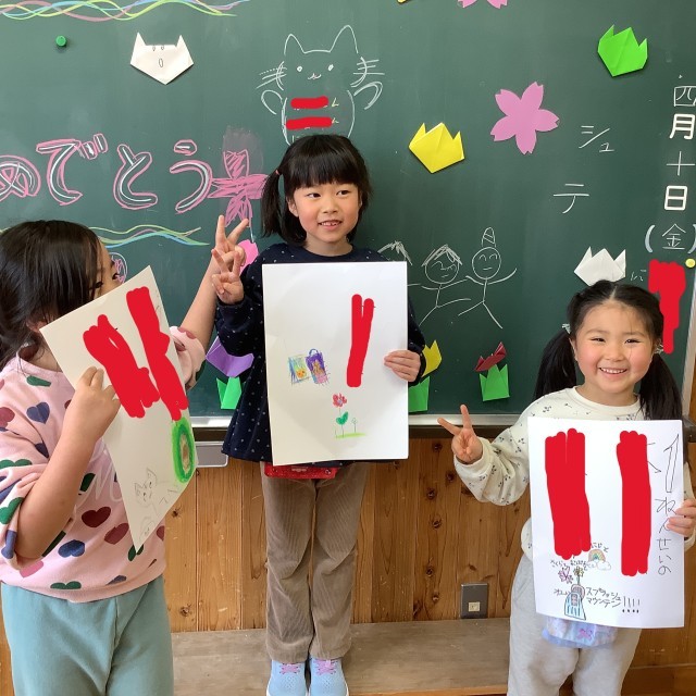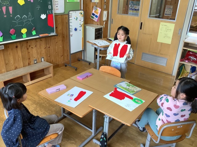 自分の名前と好きなものを絵を画用紙に書いて、お互いに発表し合いました。