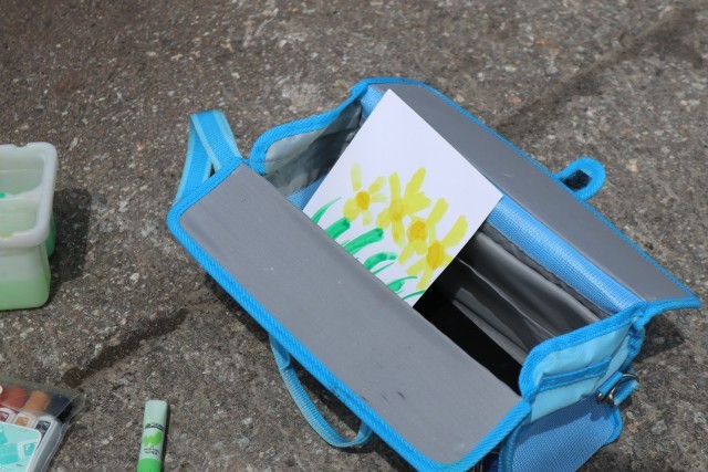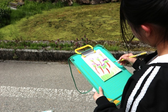「春を描こう!」と、絵の具セットを持って学校の周りの春を探しました。