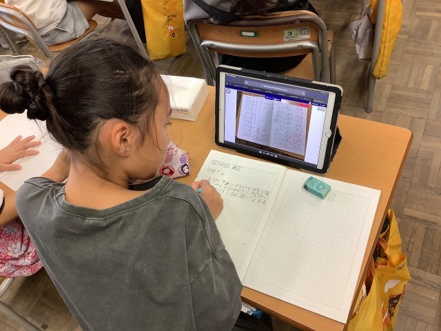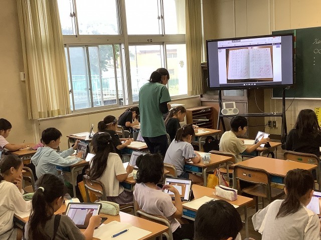 ノートを見合ったり、担任がノート紹介したりしていました。ICT機器を活用しているクラスもありました。