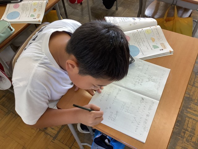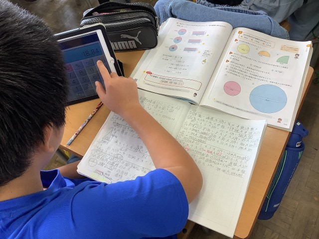 これまで見付けてきた円の面積を求める式を活用して「直径」を求める問題を解いていました。