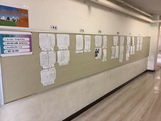 体育館に向かう渡り廊下には子どもたちが取り組んでいる自主学習ノートのコピーが掲示されています。
