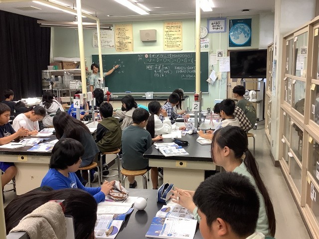 光源装置を使って月の形の変化を実際に観察実験をした後に、学習課題についてまとめていました。