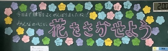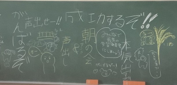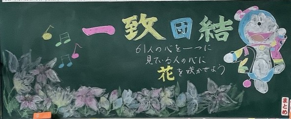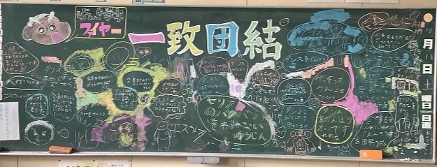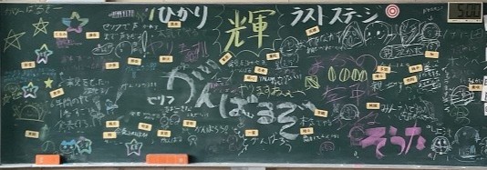 教室の黒板には熱いメッセージが書かれていました。担任から子どもたちへ。仲間から仲間へ。一人一人の思い・・・。