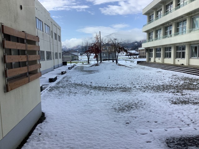昨夜からの降雪で中庭にもうっすら雪が降り積もりました。