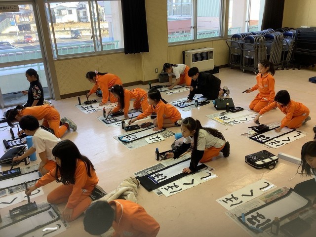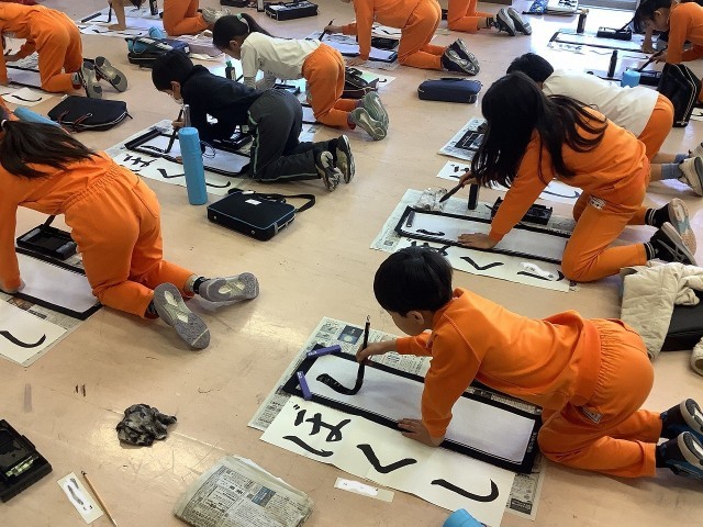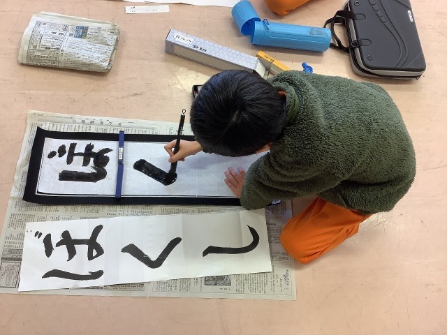 今日は初めての毛筆での書初め、しかも「条幅」用紙を使っての時間です。