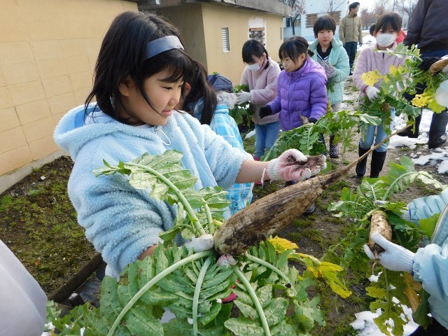 小さな種から大きく育ったダイコンを目にした子どもたちはますますうれしそうです。