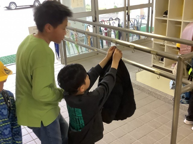 外靴を靴箱に入れ、上着を上着かけにかけます。教室に入るとランドセルから学習用品を出します。