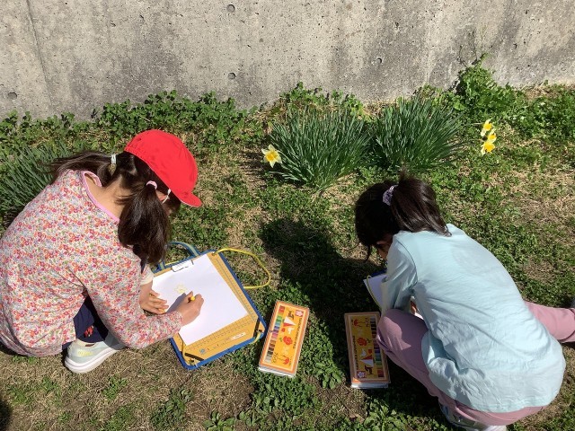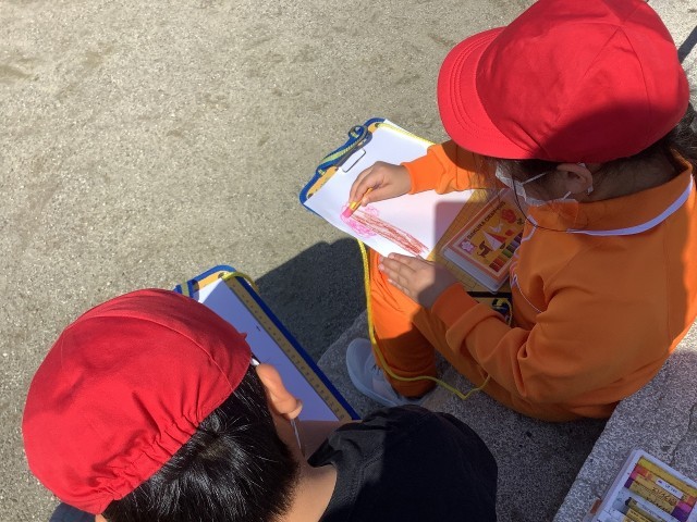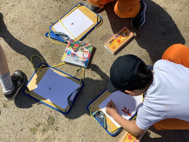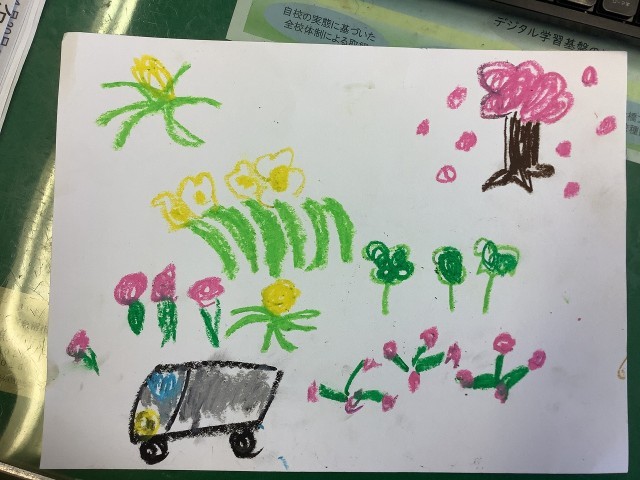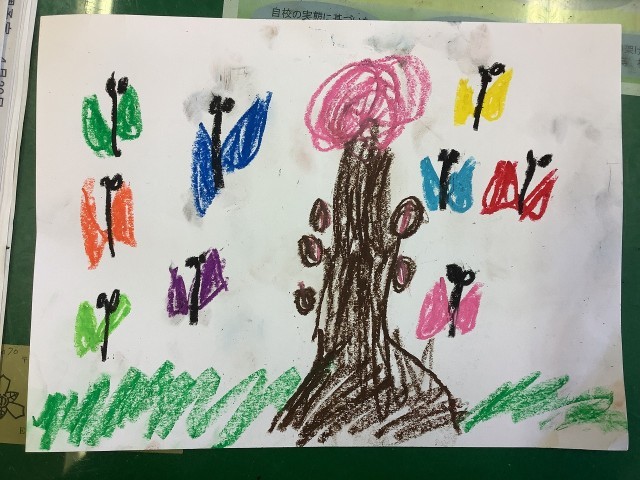 目に見えるもの、心で感じたものの中で、「描きたい」と心を震わせたものを画用紙に描きました。