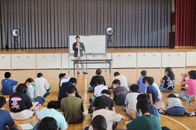 6年生は総合的な学習で、キャリア教育を進めています。6年生の子供たちが将来の夢に向けて参考になればということで、お客様からお越しいただいています。今回は、元アルビレックス新潟の投手であった、阿部拳斗さんからお越しいただきお話をしていただきました。