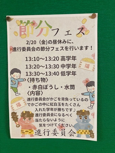 2月20日(金)の昼休みです。児童会主催の「節分フェス」が行われました。3回に分...