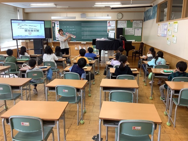 10月7日(火)の2時間目、1年生が音楽室で音楽をしていました。