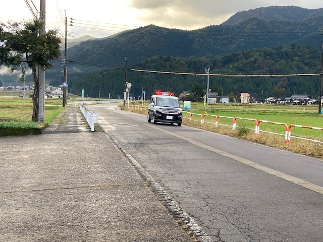 7:40頃校門に立っていると、消防団の車とパトカーが回ってきました。