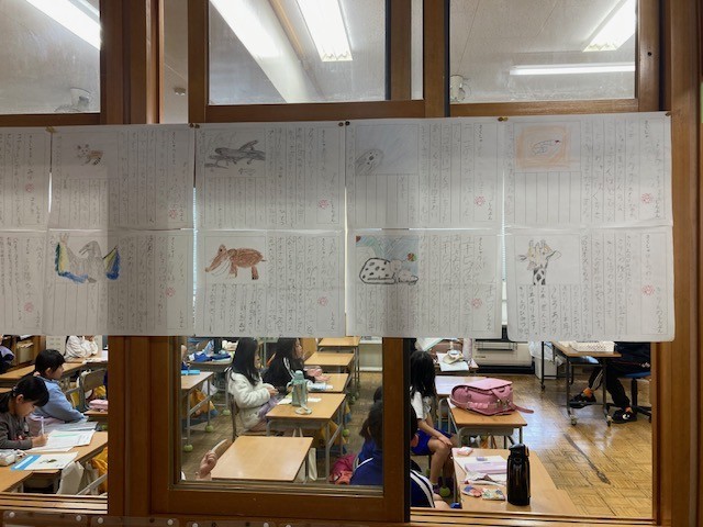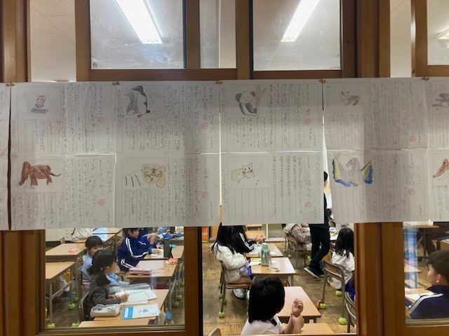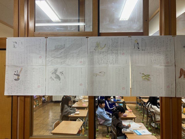 2年生の廊下には、国語の時間で作った動物新聞が飾られていました。