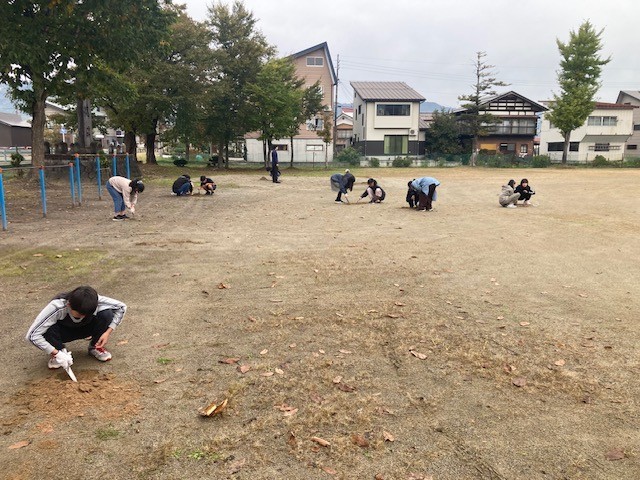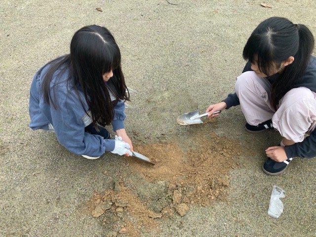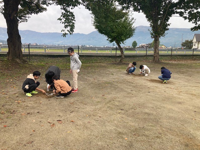 10月31日(金)の2時間目、6年生がグラウンドで穴を掘っていました。