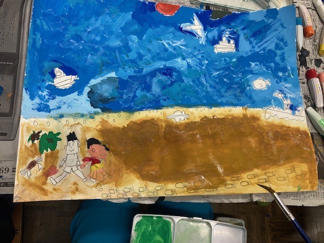 水彩画でした。花火がきれいですね。海がきれいですね。