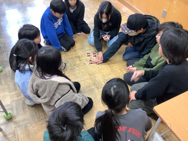 ハンカチ落とし、カードゲーム、質問クイズ、お絵かきしりとり、鬼ごっこなど、様々な活動がありました。