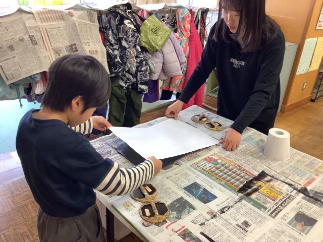 版画を刷る活動です。1人ずつ順番に行います。