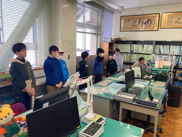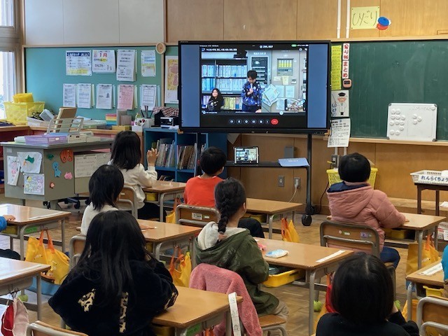 寒いので、職員室でリモートで行い、各教室へ配信しました。