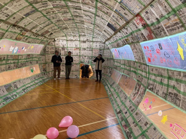4年生の新聞紙ドームが完成しました。建築士会様、保護者の皆様のご協力のおかげです。