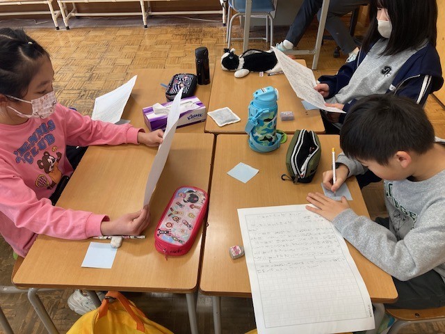 友達の作文を班で読み合っていました。