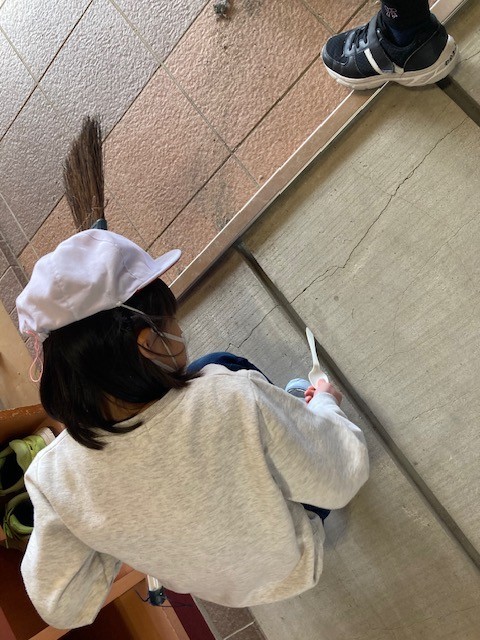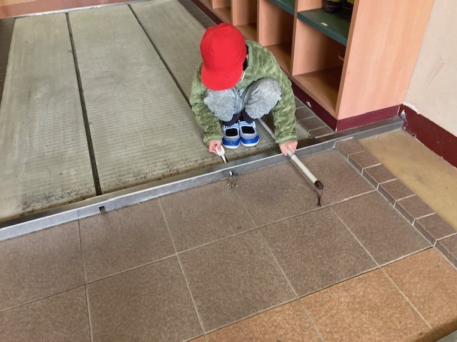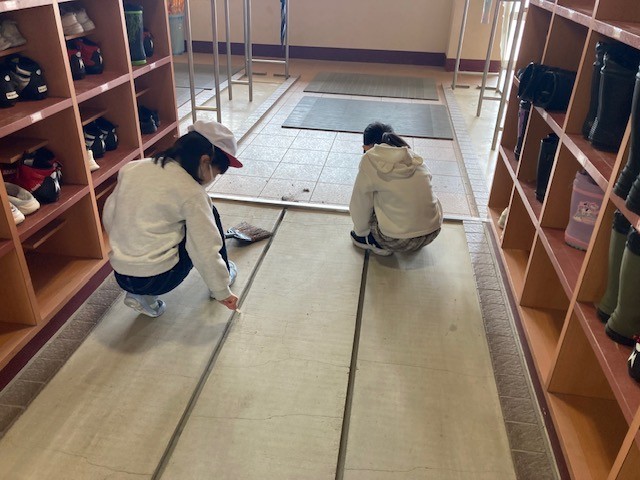 児童玄関では、マットを外して、その下にたまったゴミを清掃していました。