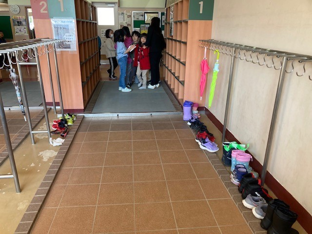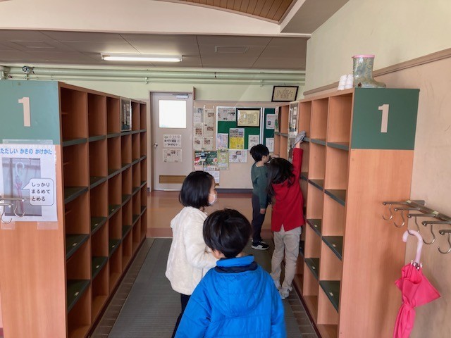 3月23日(月)の2時間目、1年生と3年生が玄関に来ていました。