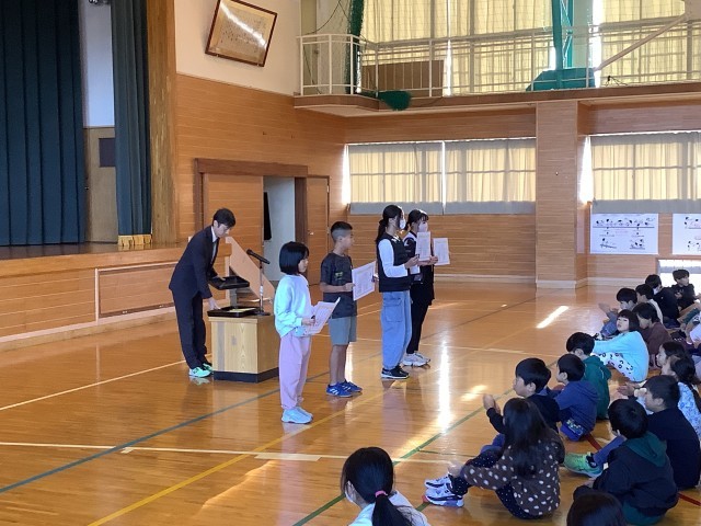 11月5日(水)の朝活動は、表彰朝会、生活朝会でした。表彰は、科学研究と県の競書...