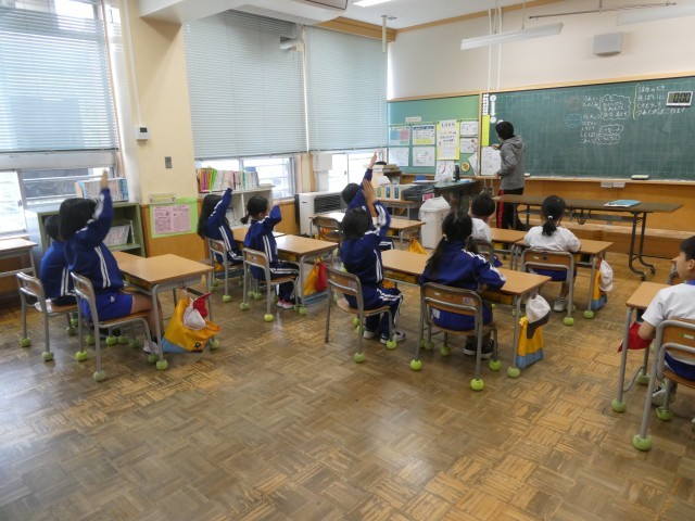 2年生の道徳の一コマ。肘がまっすぐ伸びて「発表したい!」という気持ちがあふれてい...