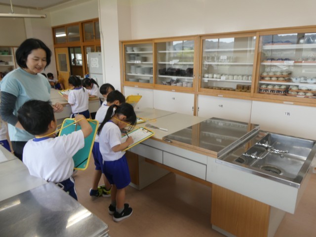 学校を探検している1年生。家庭科室にはたくさんのお皿や茶碗がありました。机の板を...