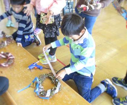 1年生児童は、アサガオを抜いたり、サツマイモを収穫したりした時に、つるを輪にしてリースをつくりました。それに飾り付けをしていたのです。グルーガンを使ってボタンや松ぼっくりを付けたり、リボンを巻いたりと、思い思いに飾り付けを楽しんでいました。30日(火)には、2年生もリースの飾り付けをしました。